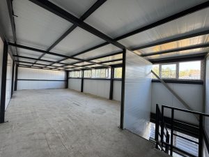 - Конструкция: Каркас ЛМК, односкатная кровля из сэндвич-панелей 150 мм.