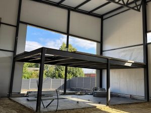 - Ограждающие конструкции: Стеновые и кровельные сэндвич-панели 150 мм. Односкатная кровля.